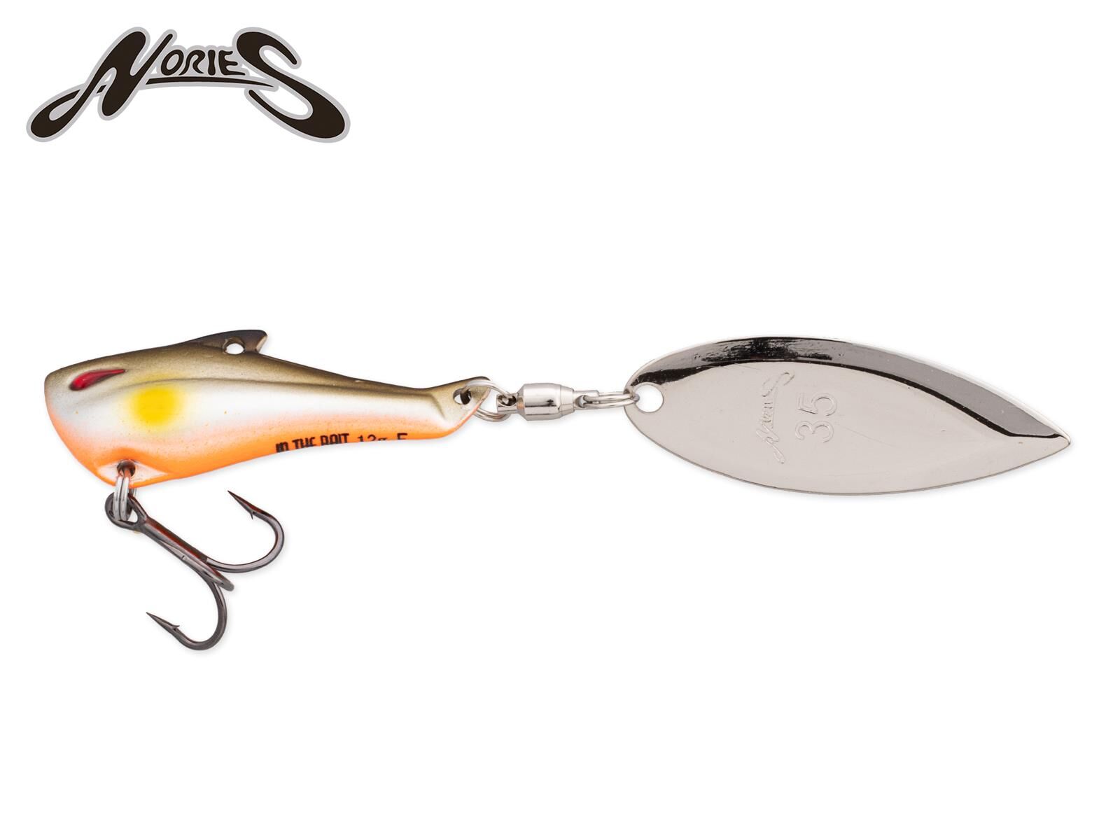 Der 12g In The Bait Bass von NORIES ist ein Jig Spinner, der sich sehr vielseitig in allen Gewässertiefen fischen lässt. Zum einen ist er bestens geeignet, um raubende Fische im Mittelwasser beim Einleiern zu suchen. Er kann aber auch grundnah gejiggt werden oder mit hoher Geschwindigkeit an der Oberfläche geführt werden. Das Besondere am In The Bait Bass ist aber das Design, dass zuverlässig verhindert, dass sich der Drilling in der Hauptschnur verfängt. Die spezielle Form des Körpers und die der Befestigungsöse an der Oberseite halten den Haken vom Vorfach fern. Das Spinnerblatt wird durch die nach oben versetzte Öse von der Schnur ferngehalten, so dass der Jig auch im Absinken immer zuverlässig spielt und Bisse provoziert. Der Körper ist aus einer harten Metallmischung gefertigt, so dass der In The Bait Bass auch nach harten Drills oder nach Steinkontakt in Form bleibt. Der In The Bait Bass Jig Spinner ist eine Bank auf Barsche und Rapfen!