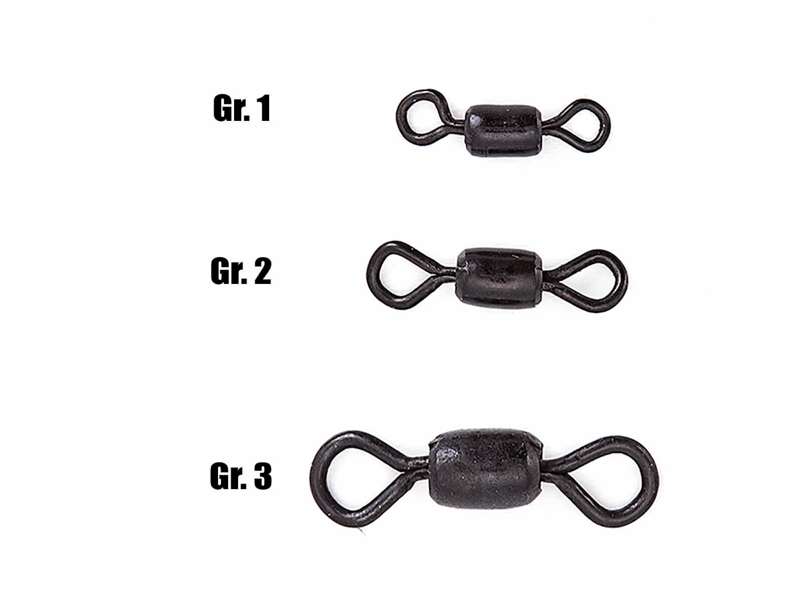 ROSCO Hochleistungswirbel. Made in USA. Gr. 12 – 6,8 kg (15 lb.) – Länge ca. 11 mm Gr. 10 – 13,6 kg (30 lb.) – Länge ca. 12 mm Gr. 7 – 34 kg (75 lb.) – Länge ca. 17 mm Farbe: matt-schwarz