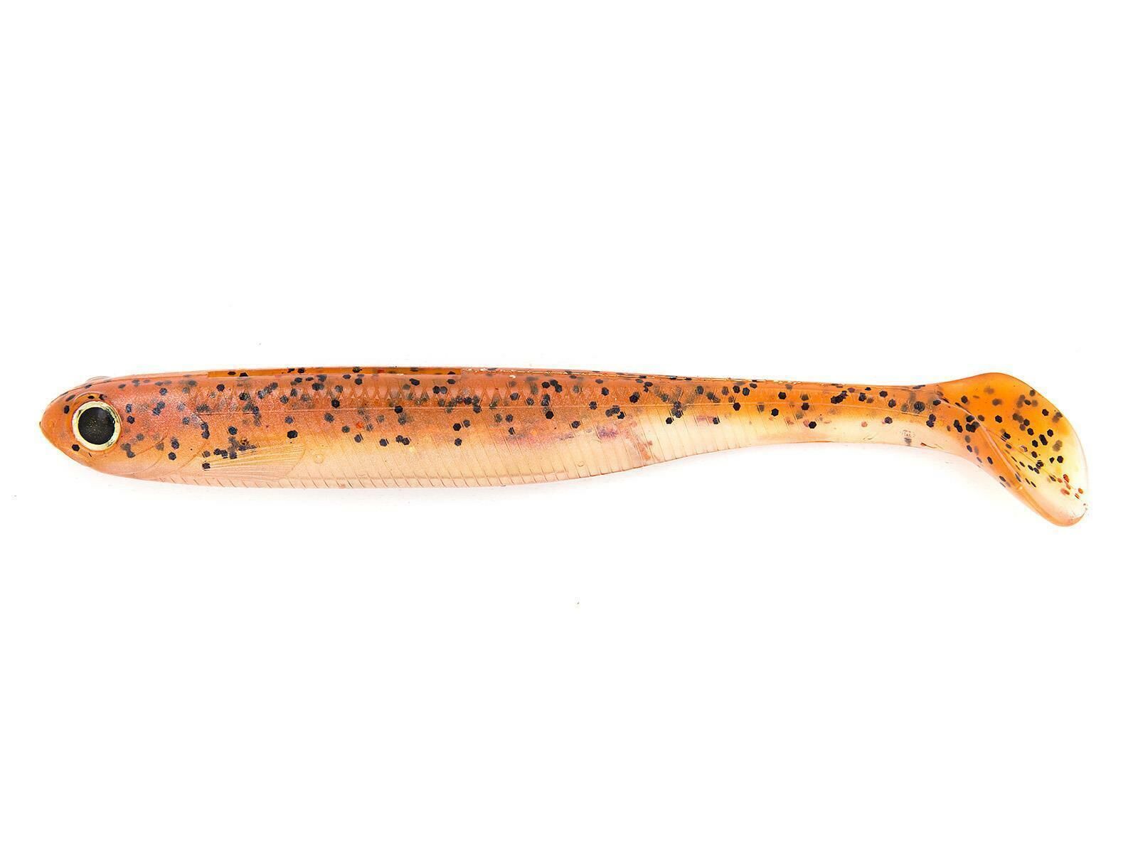 Der 4.5″ Spoon Tail Live Roll von NORIES ist ein sehr realistisch gestalteter Swimbait der neuesten Generation. Die Gummimischung des Spoon Tail Live Roll ist im Vergleich zu seinem Bruder, dem Spoon Tail Shad, etwas fester gewählt und mit einem kleinen Luftkanal im Inneren des Köders versehen, der für zusätzliche Aktion beim Lauf sorgt. Auch der Spoon Tail Live Roll hat ein sehr natürliches Aussehen. Er kann sowohl an Jigköpfen, an Weighted WideGap-Haken oder am Texas Rig gefischt werden. Durch die zwar weiche, aber im Vergleich zum Spoon Tail Shad etwas festere Gummimischung überträgt der Schwanzteller des Spoon Tail Live Roll seine starke Bewegung fast 1:1 auf den ganzen Köder. Die rollende, flankende Bewegung fällt dadurch etwas stärker und ausladender aus als beim Spoon Tail Shad. Die Frequenz des Flankens ist bei diesem Spoon Tail Modell etwas geringer, die Bewegung und somit die Druckwellen aber noch stärker. Auch die Flanken des Spoon Tail Live Roll blitzen dabei immer wieder auf. Die eingegossenen Glitterpartikel und die Augen sorgen zudem für ein sehr natürliches Aussehen. Der 4.5″ Spoon Tail Live Roll ist vor allem für große Barsche und Zander ein sehr fängiger Gummifisch!