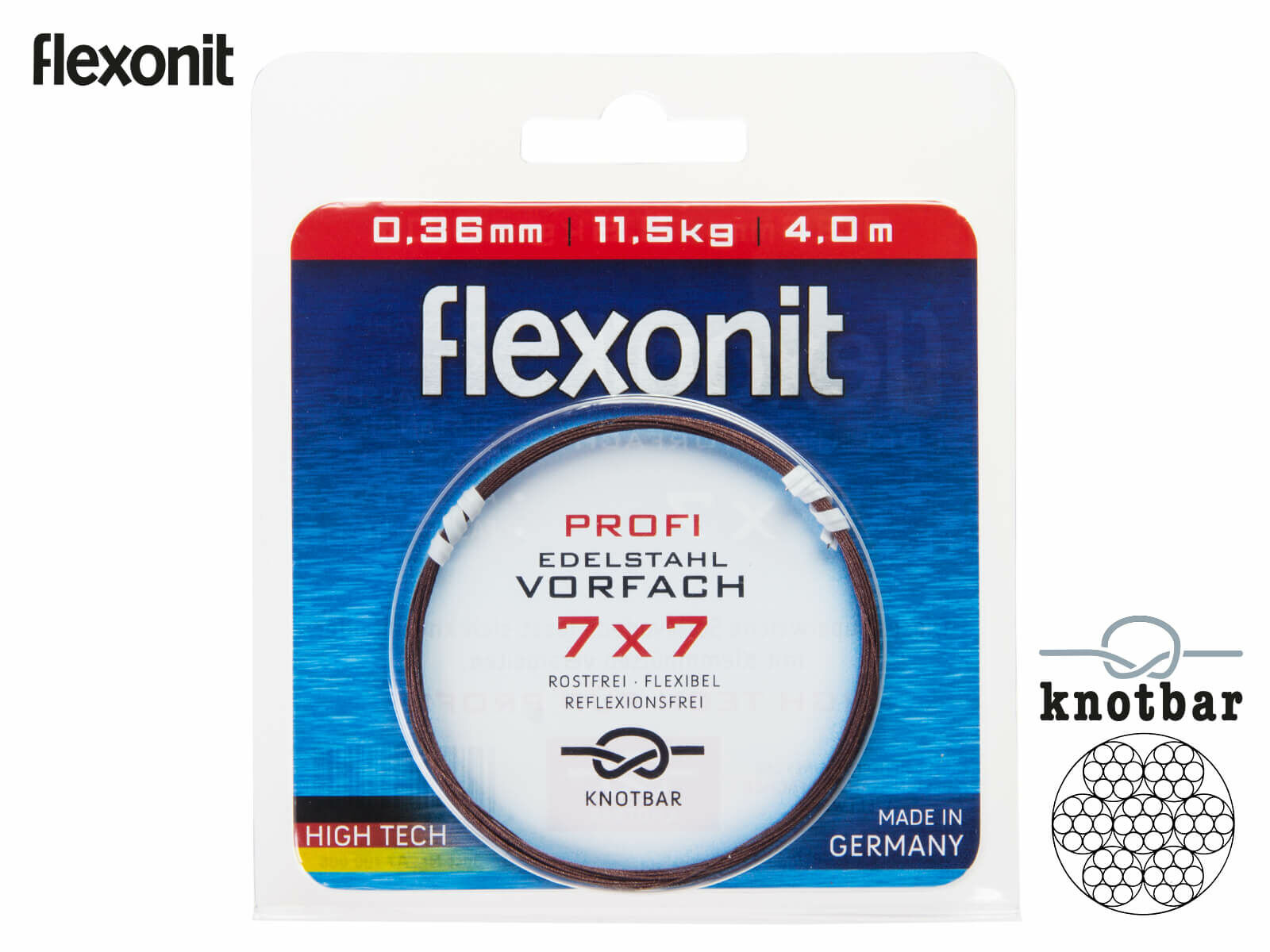Das flexonit Stahlvorfach 7×7 ist aus 49 einzelnen Fäden hergestellt. Knotbar, rostfrei, salzwasserbeständig. Fasert nicht aus, reflektionsfreie Oberfläche und starke Abriebfestigkeit. Das flexonit Stahlvorfach 7×7 deckt nahezu alle Arten des modernen Angelns ab, ob Spinn-, Schlepp-, oder Naturköderangeln. Die Geschmeidigkeit und Stärke sind die großen Vorteile dieses Vorfachmaterials.