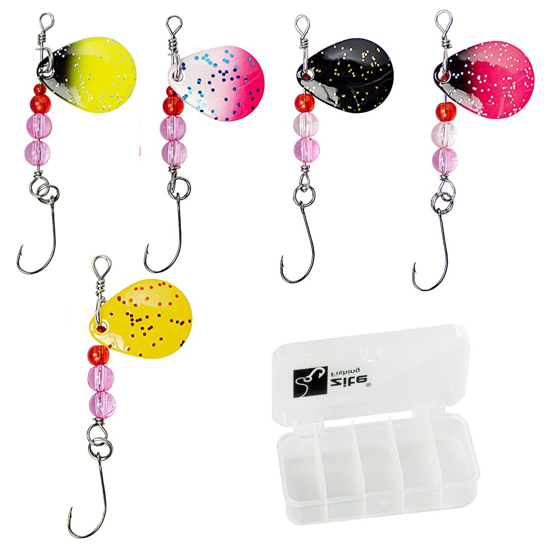 5 verschiedene Spinnerbait Angelköder in einem Ködersortiment von Zite Fishing. Die Spinjigs sind folgendermaßen sortiert: 2 x 6g + 3 x 10g und eignen sich vor allem für das Angeln auf Barsch und Zander. Aber auch Hechte sind für diesen modernen Kunstködern wohl nicht abgeneigt. 3 der 5 Dekore sind mit fluoreszierenden Teilen versehen worden, was die Angelköder noch attraktiver macht. Alle der Angelköder sind mit scharfen Drillingen versehen. Lieferung in einer passenden Köderbox.