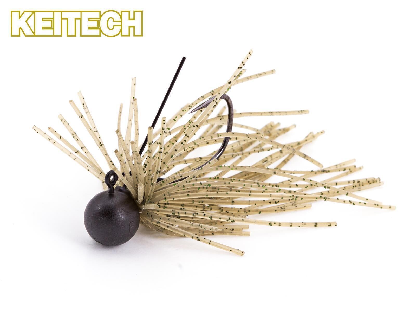 Die Mono Spin Jigs von KEITECH sind geniale kleine Finesse Jigs zum Barsch angeln in stehenden Gewässern bis 3 Meter Wassertiefe. Sie werden mit einem Trailer, wie z.B. dem 2.5″ Live Impact, dem 3″ Hog Impact oder 2″ Swing Impact gefischt. Andere Gummiköder bis max. 3″ (ca. 7,5 cm) gehen natürlich auch. Der SR-40 Silikon Skirt Tail bremst die Sinkgeschwindigkeit des Jigs deutlich ab, sorgt für reichlich Wirbel unter Wasser und reflektiert viel Licht. Geführt wird er mit kleinen Sprüngen in Grundnähe, um so immer ein bißchen Sediment aufzuwirbeln. Den Mono Spin Jig sollte man ruhig etwas am Grund liegen lassen. Selbst nach längerer Wartezeit kriegt man noch Bisse, da der Skirt Tail nie wirklich still steht unter Wasser. Der Mono Spin Jig ist ein absolutes MUSS, wenn man es gezielt auf dicke Barsche abgesehen hat!