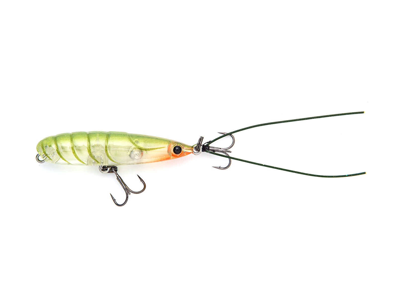 Der PX 45F ist ein kleiner Topwater Lure, der eine fliehende Garnele imitiert. Im vorderen Bereich hat er eine kleine Aushöhlung und am Enddrillling sind zwei Silikon-Fäden befestigt. Geführt wird er direkt an der Wasseroberfläche mit kleinen Zupfern, wobei er leise Plopp-Geräusche verursacht. Wichtig ist, dass der PX 45F mit dünnem monofilem Vorfach, bzw. mit eingefettetem Fluorocarbon-Vorfach ohne Wirbel & Snaps gefischt werden muß. Die feinen, aber dennoch sehr stabilen Owner-Drillinge ermöglichen auch die sichere Landung größerer Räuber. Ein sehr schöner Oberflächenköder für die leichte Barsch- und Forellenangelei!