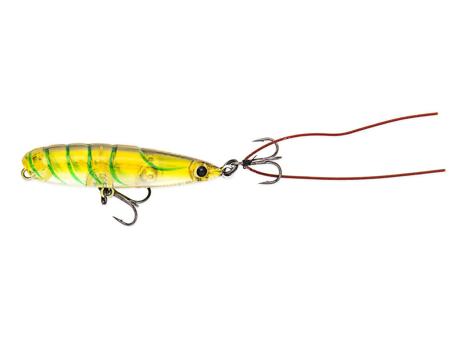 Der PX 45F ist ein kleiner Topwater Lure, der eine fliehende Garnele imitiert. Im vorderen Bereich hat er eine kleine Aushöhlung und am Enddrillling sind zwei Silikon-Fäden befestigt. Geführt wird er direkt an der Wasseroberfläche mit kleinen Zupfern, wobei er leise Plopp-Geräusche verursacht. Wichtig ist, dass der PX 45F mit dünnem monofilem Vorfach, bzw. mit eingefettetem Fluorocarbon-Vorfach ohne Wirbel & Snaps gefischt werden muß. Die feinen, aber dennoch sehr stabilen Owner-Drillinge ermöglichen auch die sichere Landung größerer Räuber. Ein sehr schöner Oberflächenköder für die leichte Barsch- und Forellenangelei!